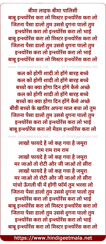 Lyrics of Bima Life Bima Policy, Babu Insurance Kara Lo - बीमा लाइफ बीमा पालिसी, बाबू इन्श्योरेंस करा लो