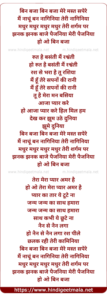 Lyrics of Been Baja Mere Mast Sapere - बिन बजा मेरे मस्त सपेरे