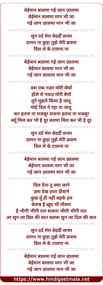 Lyrics of Beimaan Baalamaa Gayi Jaan Jaalmaa - बेईमान बालमा गई जान ज़ालमा