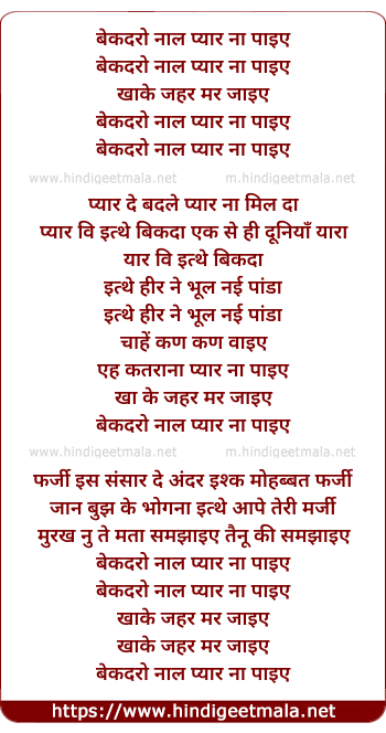 Lyrics of Bekadro Naal Pyar - बेकदरो नाल प्यार
