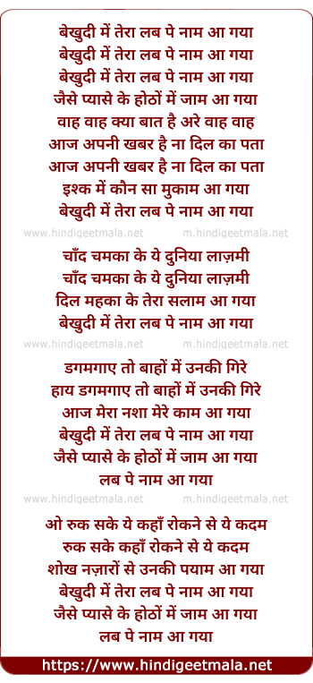 Lyrics of Bekhudi Me Tera Lab Pe Naam - बेखुदी में तेरा लब पे नाम