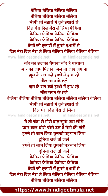 Lyrics of Beliya Beliya Bhigi Si Baharo Me - बेलिया बेलिया भीगी सी बहारो में