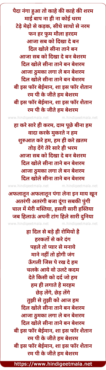 laga le ban besharam Dil khol seena taane ban besharam Be is for Beimaan,