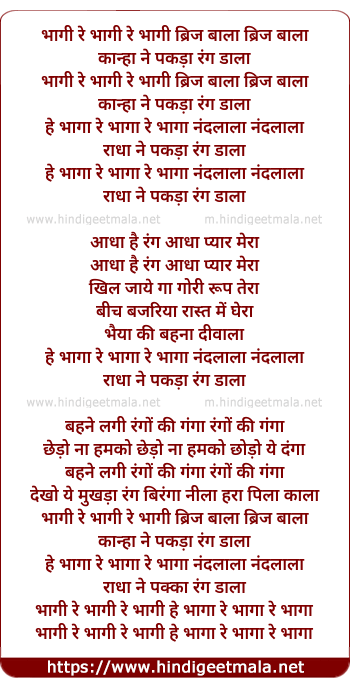 Lyrics of Bhagi Re Bhagi Re Bhagi Brijbala - भागी रे भागी रे भागी ब्रिज बाला