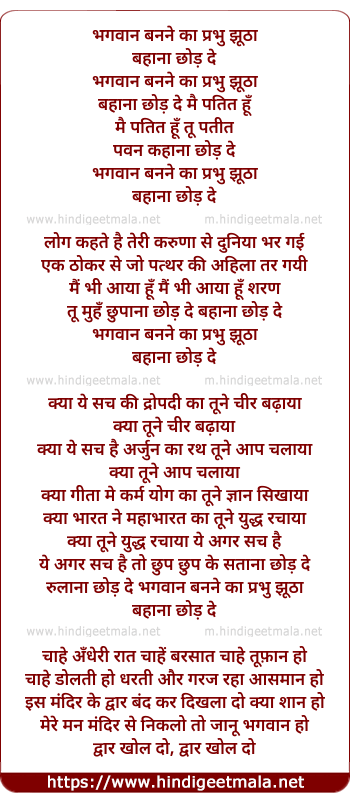 Lyrics of Bhagwan Banne Ka Prabhu Jutha Bahana Chhod De - भगवान बनने का प्रभु झूठा बहाना छोड़ दे