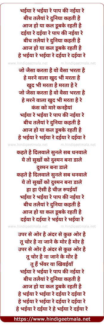 Lyrics of Bhaiyya Re Bhaiyya Re Paap Ki Naiya Re - भईया रे भईया रे पाप की नईया रे