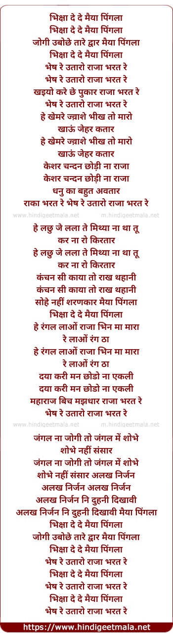 Lyrics of Bhiksha De De Maiya Pingala - भिक्षा दे दे मैया पिंगला