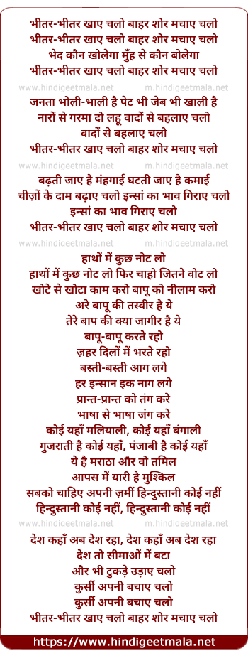 Lyrics of Bhitar Bhitar Khaae Chalo Baahar Shor - भीतर-भीतर खाए चलो बाहर शोर
