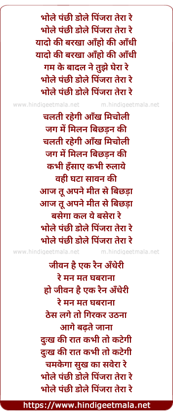 Lyrics of Bhole Panchhi Dole Pinjara Tera Re - भोले पंछी डोले पिंजरा तेरा रे