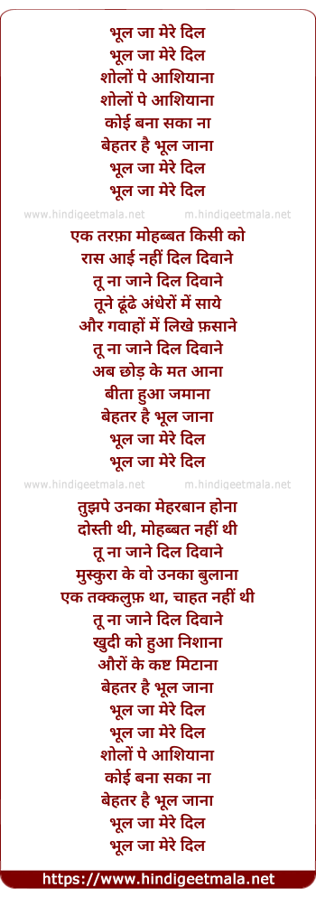 Poetic Translation - Lyrics of Bhool Jaa Mere Dil (Male) - भूल जा मेरे दिल