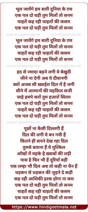 Lyrics of Bhul Jaayenge Ham Sari Duniya Ke Gum - भूल जायेंगे हम सारी दुनिया के ग़म