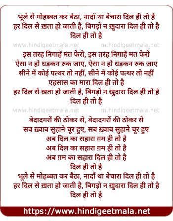 Lyrics of Bhule Se Mohabbat Kar Baithaa, Dil Hi To Hai - भूले से मोहब्बत कर बैठा, नादाँ था बेचारा दिल ही तो है
