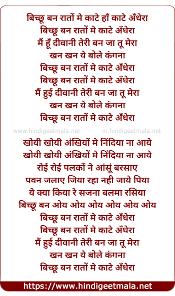 Lyrics of Bichhu Ban Raato Me Kaate Andhera - बिच्छू बन रातों में काटे अँधेरा