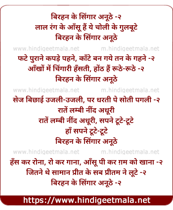 Lyrics of Birahan Ke Singaar Anuthe - बिरहन के सिंगार अनूठे -२