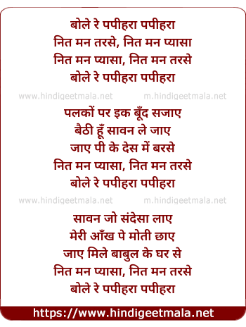 Lyrics of Bole Re Papihara, Papihara - बोले रे पपीहरा पपीहरा