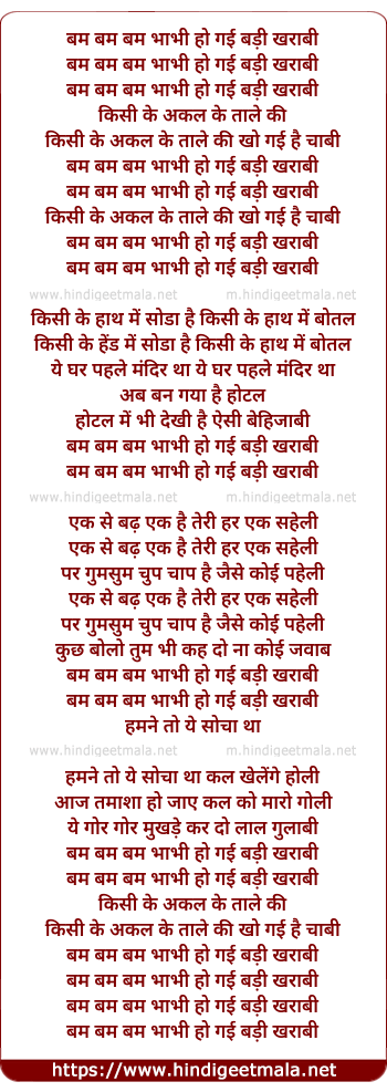 Lyrics of Bum Bum Bum Bhabhi Ho Gayi Badi Khrabi - बम बम बम भाभी हो गई बड़ी खराबी