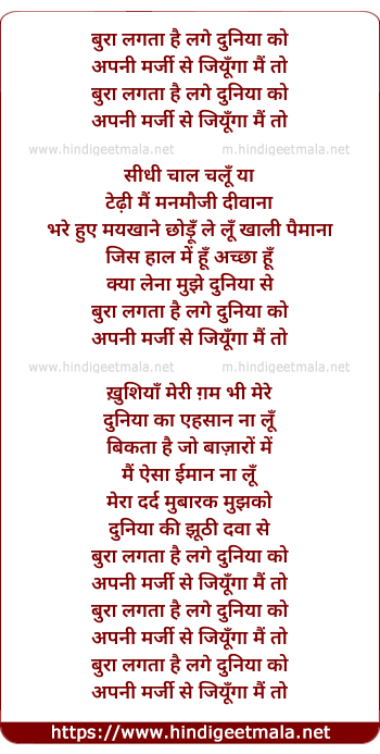 Lyrics of Buraa Lagataa Hai Lage Duniyaa Ko - बुरा लगता है लगे दुनिया को
