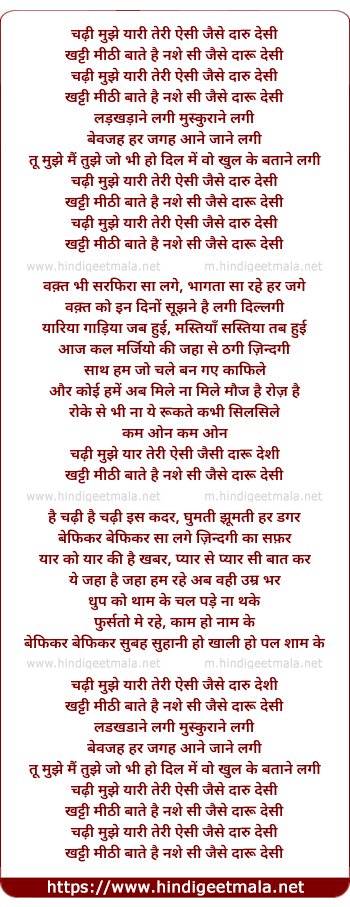 Lyrics of Chadi Mujhe Yaari Teri Aisi Jaise Daaru Desi - चढ़ी मुझे यारी तेरी ऐसी जैसे दारु देसी