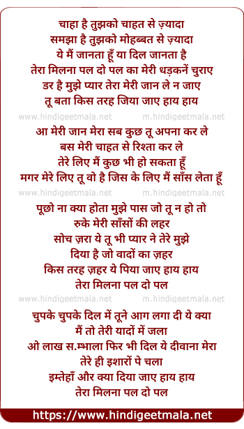 Lyrics of Chaha Hai Tujhko Chahat Se Jyada - चाहा है तुझको चाहत से ज़्यादा
