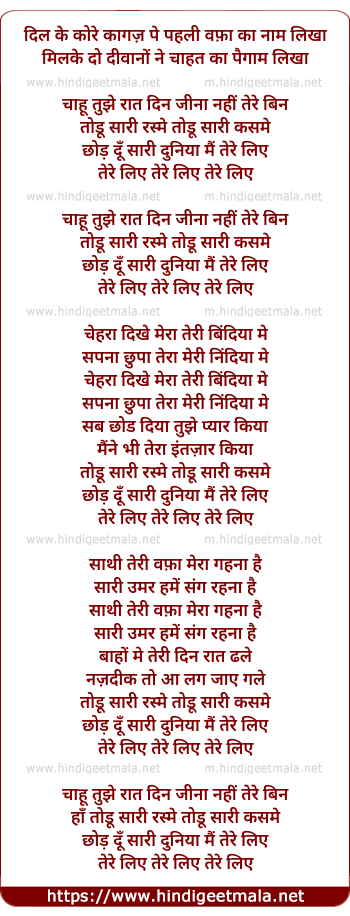 Lyrics of Chahu Tujhe Raat Din - चाहू तुझे रात दिन