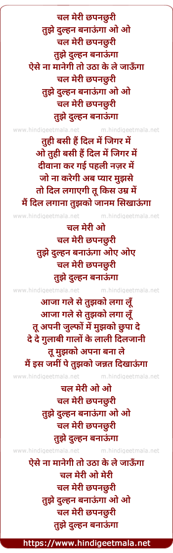 Lyrics of Chal Meri Chhapanchuri Tujhe Dulhan Banaunga - चल मेरी छपनछुरी तुझे दुल्हन बनाऊँगा