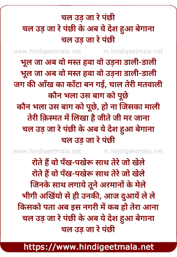 Lyrics of Chal Ud Ja Re Panchhi, Ke Ab Ye Desh Hua Begana (Part 2) - चल उड़ जा रे पंछी, के अब ये देश हुआ बेगाना
