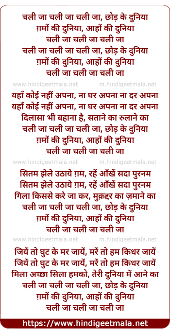 Lyrics of Chalee Ja Chalee Ja, Chhod Ke Duneeya - चली जा चली जा चली जा, छोड़ के दुनिया