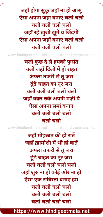 Lyrics of Chalo Chalo Chalo Chalo - जहाँ होगा सुकूं जहाँ ना हो आसू
