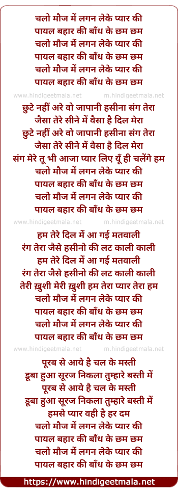 Lyrics of Chalo Mauj Me Lagan Leke Pyar Ki - चलो मौज में लगन लेके प्यार की