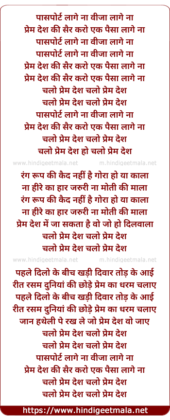 Lyrics of Chalo Prem Desh - चलो प्रेम देश