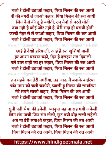 Lyrics of Chalo Re Dolee Uthao Kahar - चलो रे डोली उठाओ कहार