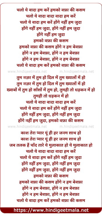 Lyrics of Chalo Ye Vaada Ham Karein Hamako Vafa Ki Kasam - चलो ये वादा हम करें हमको वफ़ा की कसम
