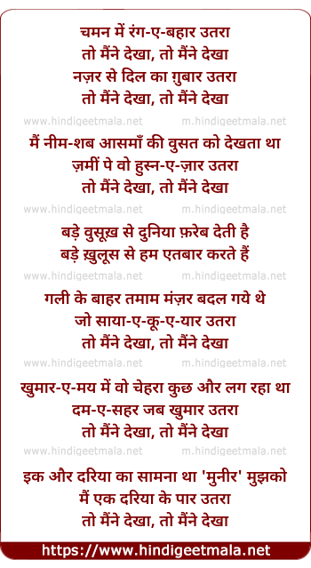 Lyrics of Chaman Men Rang E Bahaar Utaraa To Mainne Dekhaa - चमन में रंग-ए-बहार उतरा