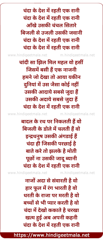 Lyrics of Chanda Ke Des Me Rehti Ek Rani - चंदा के देश में रहती एक रानी