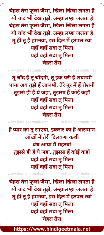 Lyrics of Chehara Tera - चेहरा तेरा फूलों जैसा, खिला खिला लगता हैं