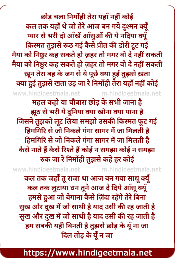 Lyrics of Chhod Chala Nirmohi - छोड़ चला निर्मोही तेरा यहाँ नहीं कोई