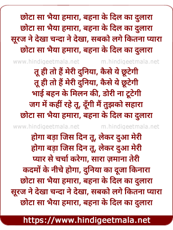 Lyrics of Chhotaa Saa Bhaiyaa Hamaaraa, Bahanaa Ke Dil Kaa Dulaaraa - छोटा सा भैया हमारा, बहना के दिल का दुलारा