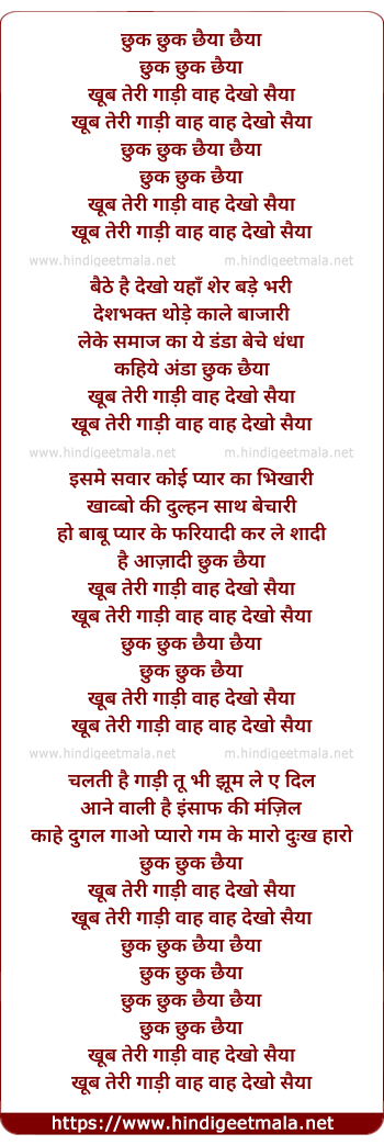 Lyrics of Chhuk Chhuk Chaiyan Khub Teri - छुक छुक छैया खूब तेरी