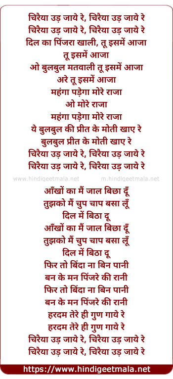 Lyrics of Chiraiya Udi Jaye Re - चिरैया उड़ जाये रे