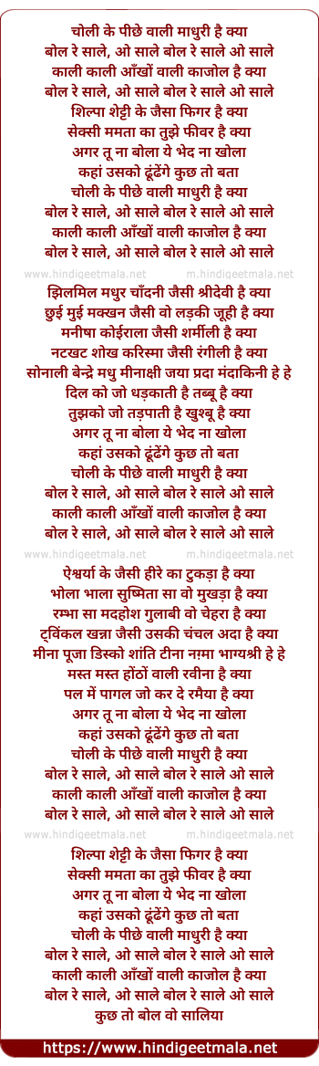 Lyrics of Choli Ke Pichhe Vaali Maadhuri Hai Kyaa - चोली के पीछे वाली माधुरी है क्या