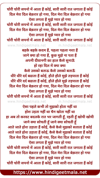 Lyrics of Choree Choree Sapno Me Aata Hai Koyi - चोरी चोरी सपनो में आता हैं कोई