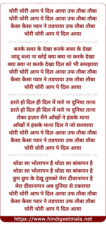 Lyrics of Chori Chori Aap Pe Dil Aaya - चोरी चोरी आप पे दिल आया