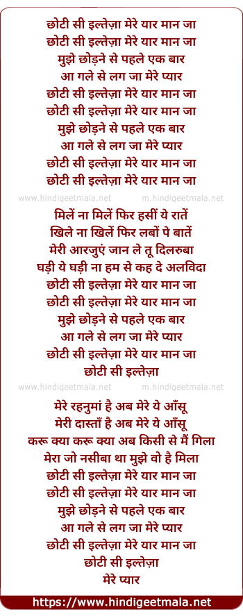 Lyrics of Choti Si Iltaza Mere Yaar Maan Ja - छोटी सी इल्तेज़ा मेरे यार मान जा