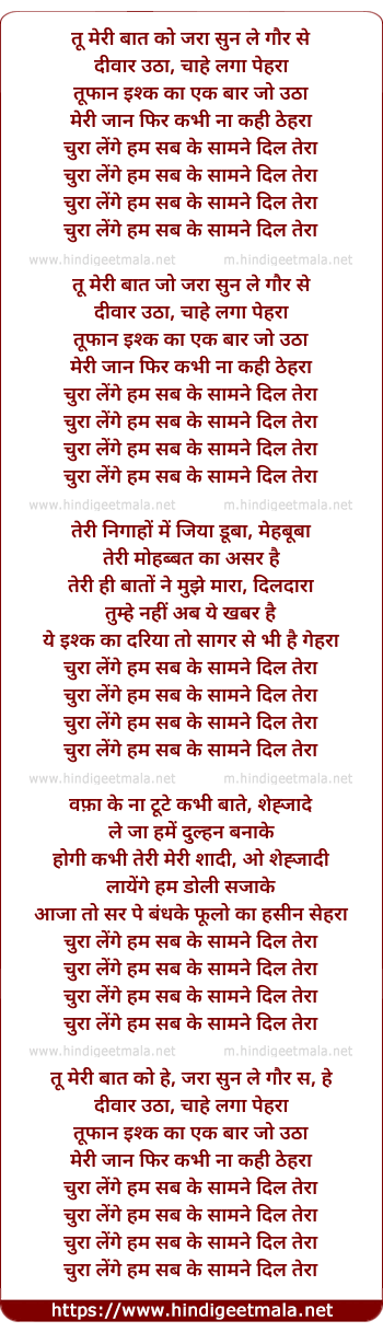 Poetic Translation - Lyrics of Chura Lenge Hum Sab Ke Samne Dil Tera - चुरा लेंगे हम सब के सामने दिल तेरा