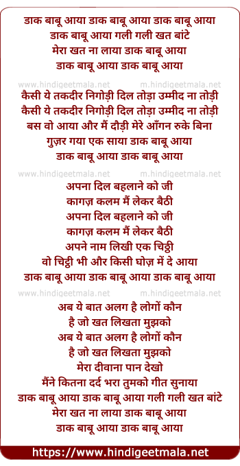 Lyrics of Daak Babu Aaya, Gali Gali Khat Baante Mera Khat Na Laya - डाक बाबू आया, गली गली खत बांटे मेरा खत ना लाया