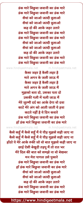 Lyrics of Dank Mare Bichuwa Jawani Ka Dank Mare - डंक मारे बिछुवा जवानी का डंक मारे