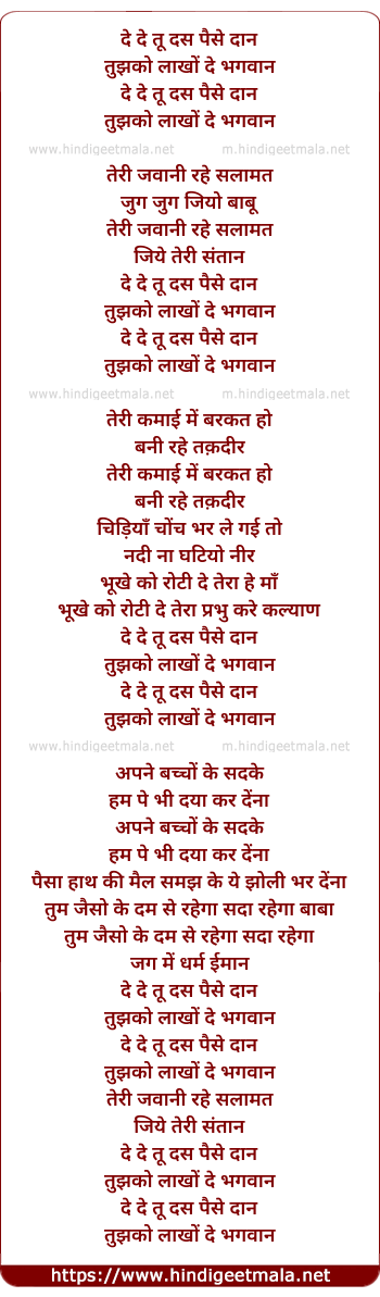 Lyrics of De De Tu Dus Paise Daan - दे दे तू दस पैसे दान