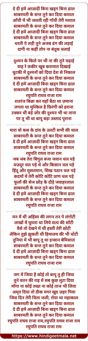 Lyrics of De Di Hame Aazadi Bina Khadag Bina Dhaal - दे दी हमें आज़ादी बिना खड्ग बिना ढाल