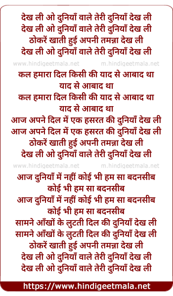 Lyrics of Dekh Li O Dooniya Wale - देख ली ओ दुनियाँ वाले