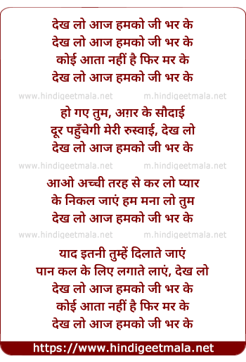 Lyrics of Dekh Lo Aaj Hamako Ji Bharake - देख लो आज हमको जी भर के